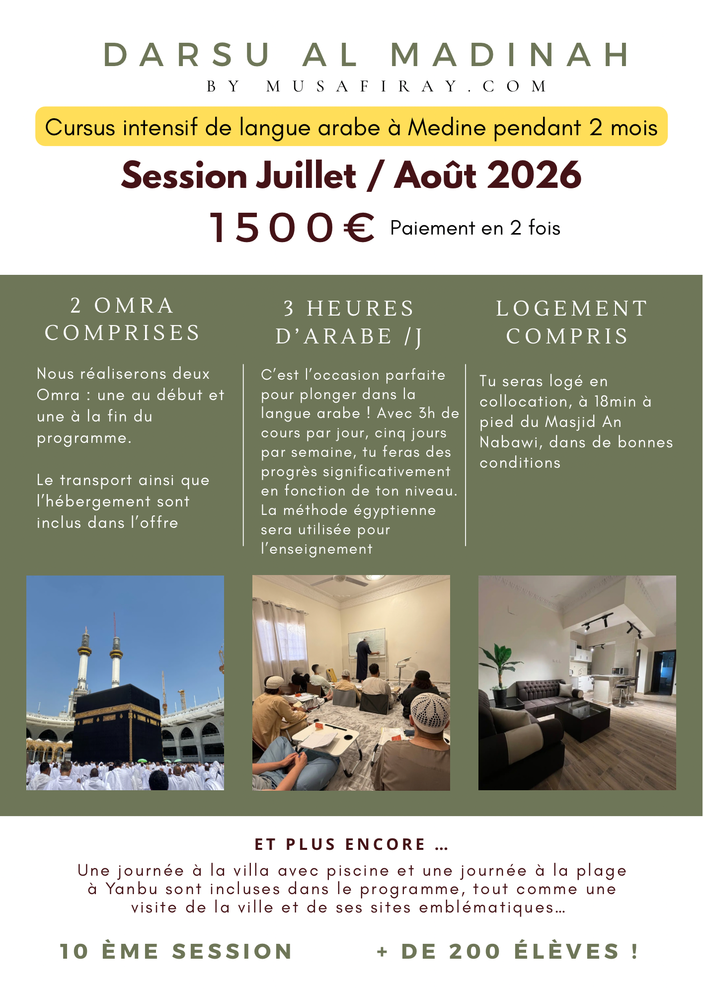 - Des sorties : Une journée a la plage de Yanbu et une journée dans une Villa avec piscine.